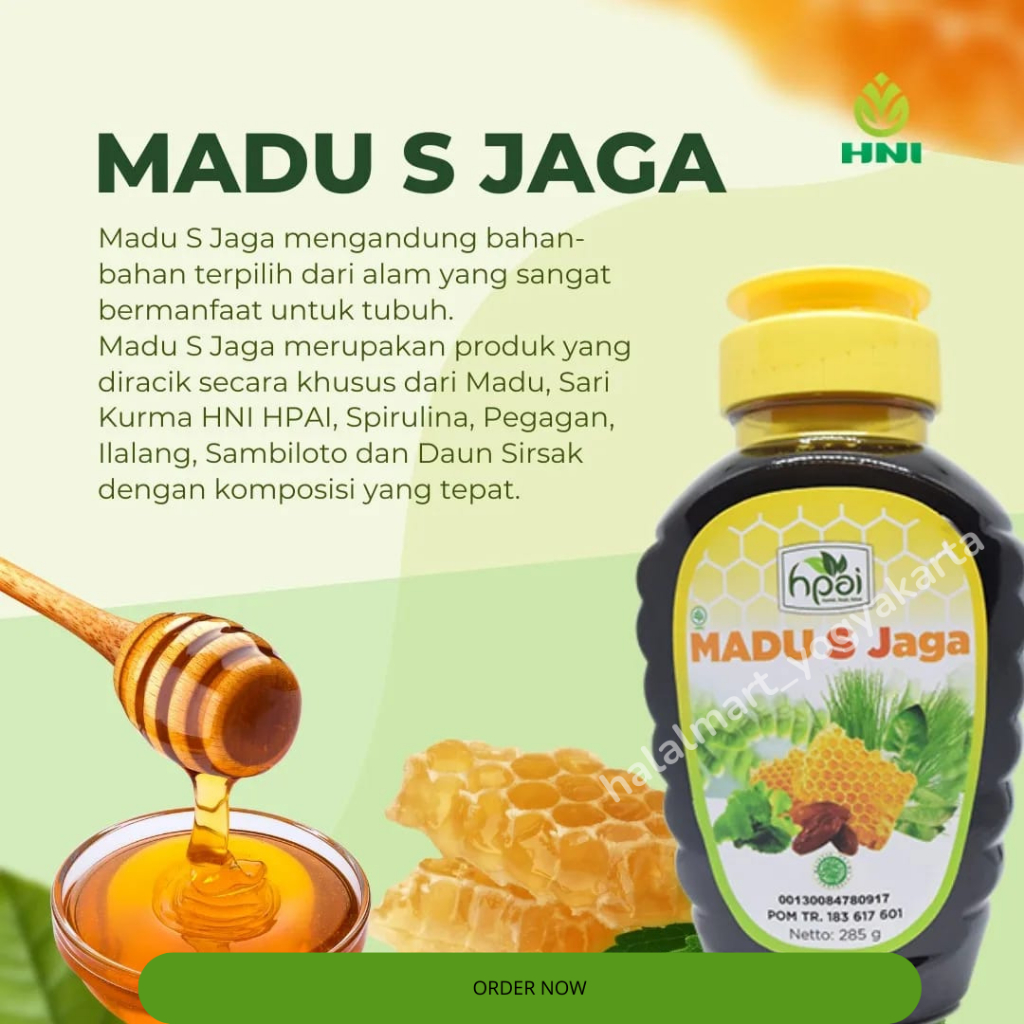 Madu S Jaga merupakan produk yang diracik secara khusus dari Madu, Sari Kurma HNI HPAI, Spirulina, Pegagan, Ilalang, Sambiloto dan Daun Sirsak dengan komposisi yang tepat.