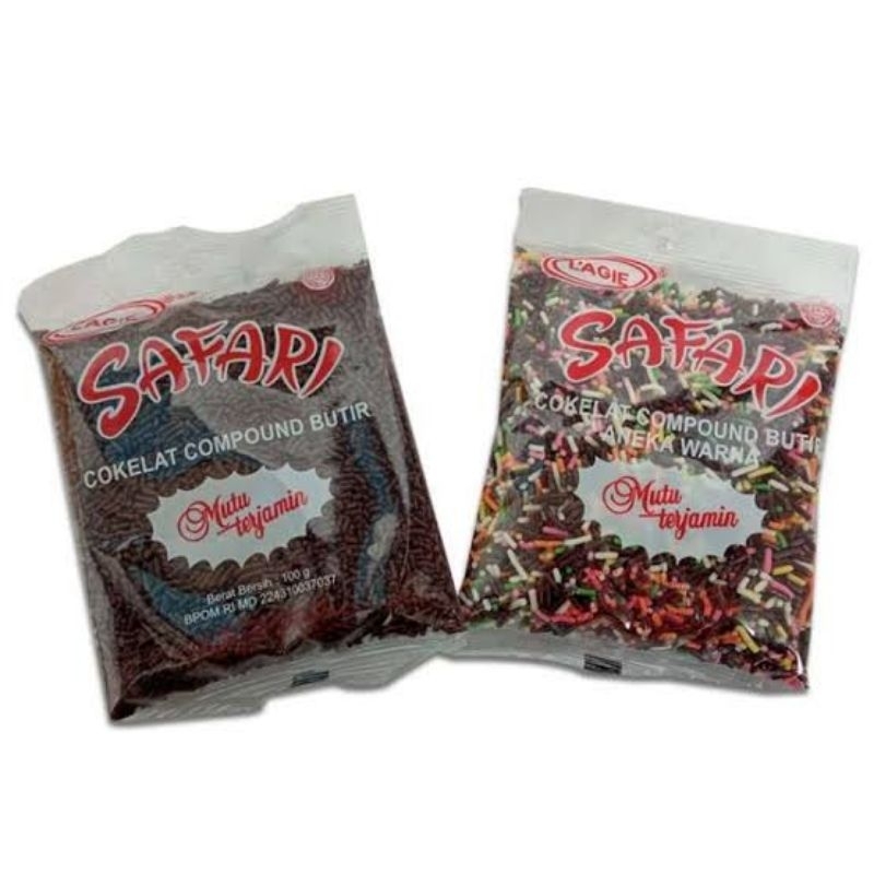 Safari Meses/Meises/Sprinkles adalah salah satu produk cokelat dari brand LAGIE. Berupa cokelat compound butir/taburan yg biasa kita sebut meses/meises. Dibuat dgn cokelat bermutu jaminan LAGIE dgn standar kualitas tinggi, dan rasa yg ga kalah dgn brand2 nasional yg sudah terkenal. Sangat ideal utk taburan roti anda maupun di konsumsi langsung utk cemilan. Harga hemat bersahabat dgn kemasan higienis yg baik. Dijual dgn pilihan ukuran netto 100gr, beratribut lengkap PIRT dan Halal MUI. Produksi PT. Fajar Mataram Sedayu - Bandung. Perusahaan ini sudah berkiprah di dunia coklat Bandung selama hampir lebih dari 30 thn. Banyak produk yg dihasilkan menempati pasar coklat lokal maupun nasional. Varian yg tersedia: