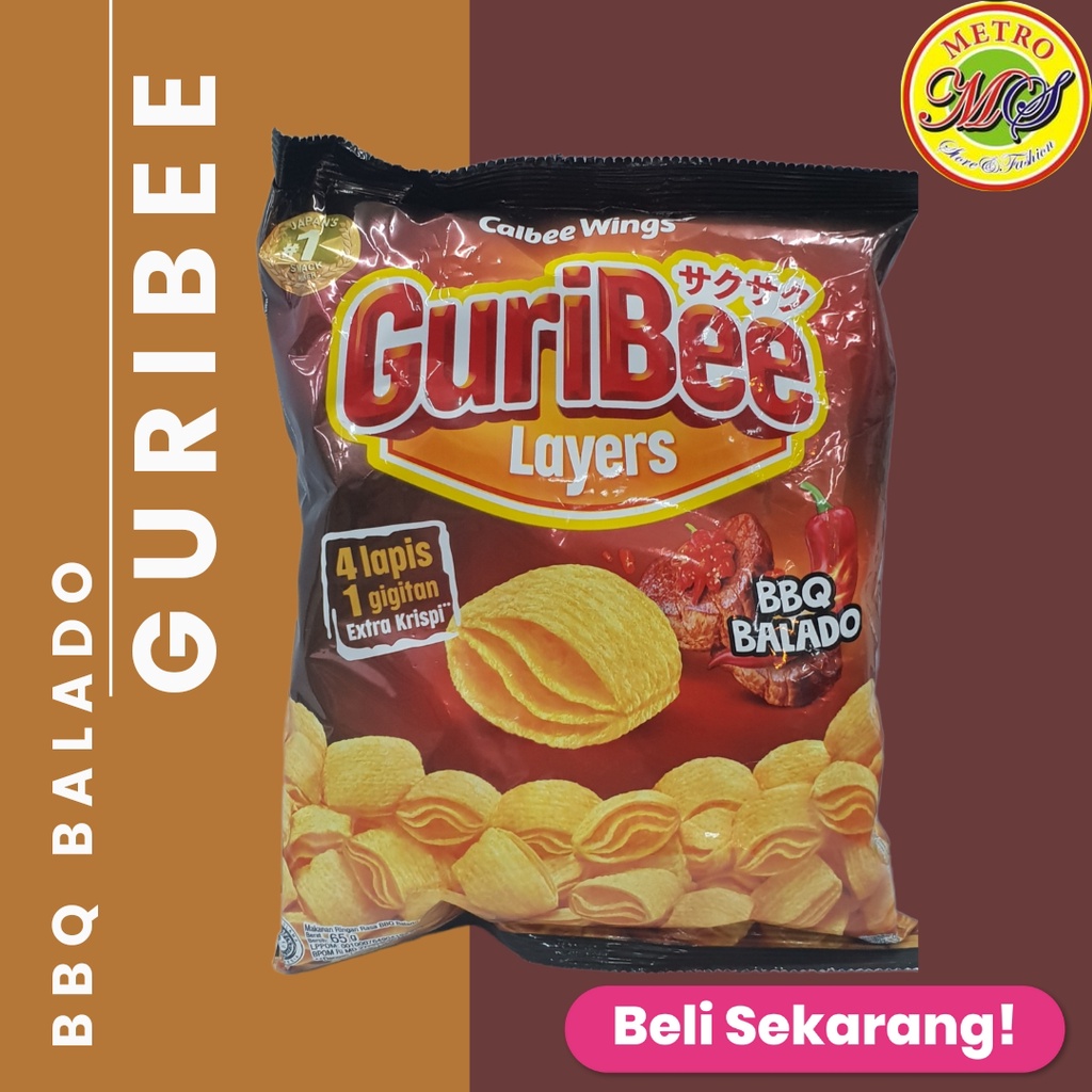 Guribee BBQ Balado 65 gr merupakan snack terbaru dari Calbee Wings dengan sensasi kerpik kentang asli dengan taburan bumbu BBQ dan Rumput Laut yang enak dan gurih BPOM BPOM RI MD 272928050128,Shelf Life: 7 Bulan