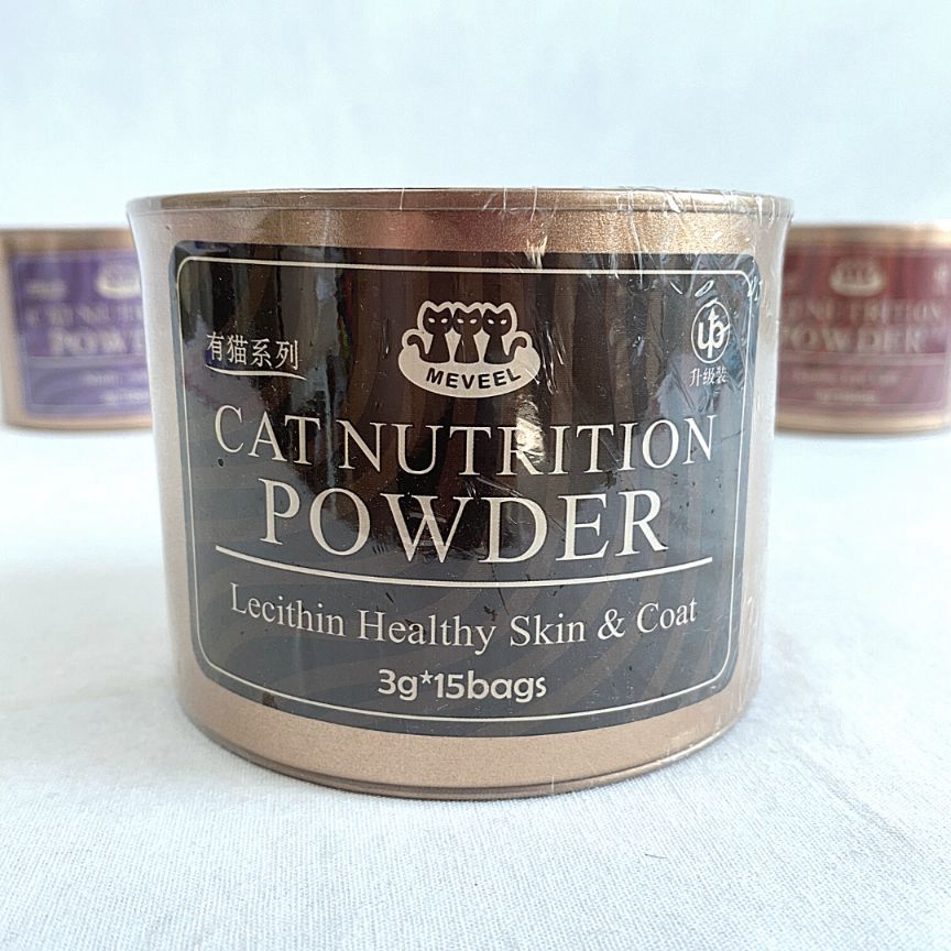 Meveel Multi -nutrition cat powder 3g15pcsMeveel Lecithin explosive cat powder 3g15pcs - healthy skin&coatMeveel Lysine cat nose powder 3g15pcs - Eye & nose careProduction Description:This product is rich in lecithin, which is high-quality ingredient forprotecting fur and skin. It also mixes the taste of fresh fish that cats like.Ingredients:Lecithin, Chicken, Fish, Oat flour, wheat gluten, Glucose, collagen, Taurine,Calcium hydrogen phosphate.