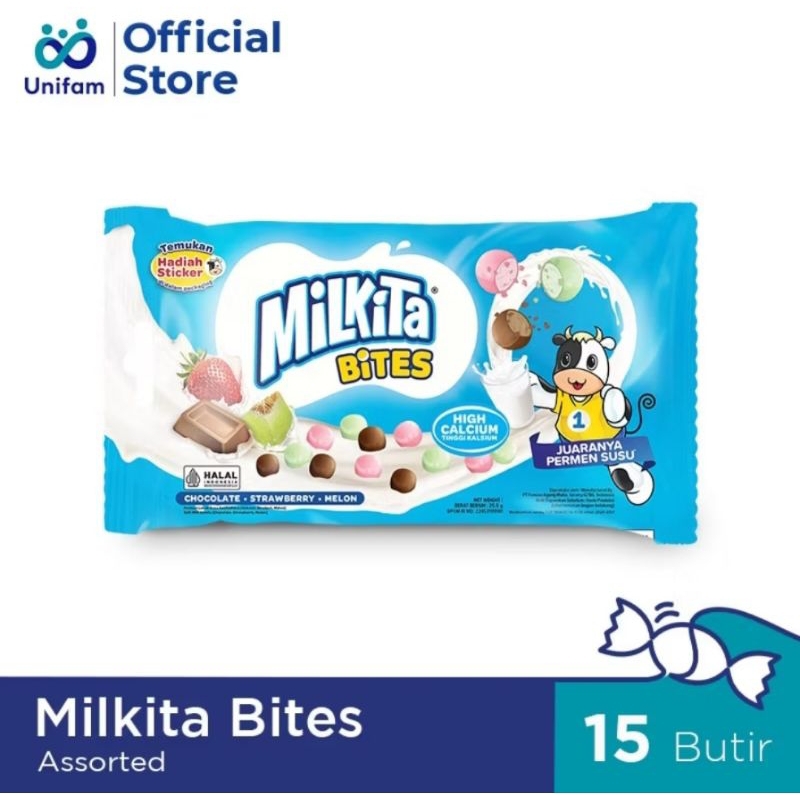 milkita bites: permen susu berkalsium tinggi dari susu segar,terdiri dari 3 rasa strawberry,cokelat,melon