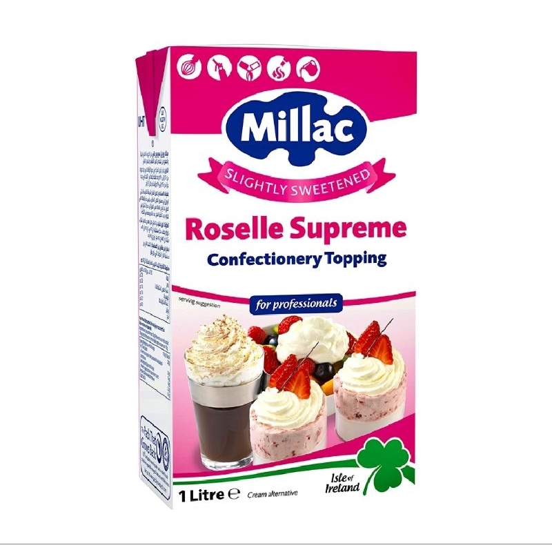 "Millac Roselle Supreme Cream adalah krim Dairy dengan rasa yang sedikit dimaniskan cocok untuk topping dessert and drink. Terbuat dari campuran susu skim dan minyak sayur, produk ini memberikan hasil akhir yang lebih mewah dan berkualitas premium untuk whipping, piping dan dekorasi