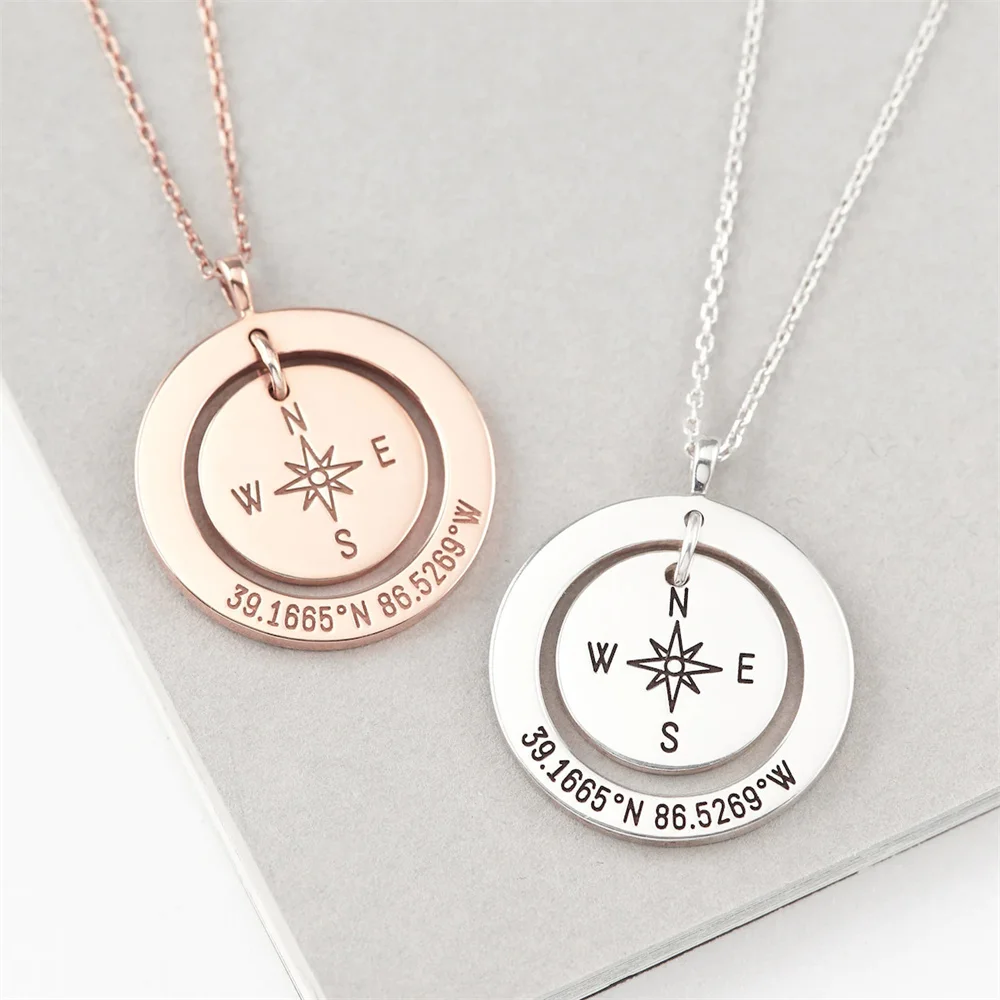 Customized location Necklaces Round Disc Pendant Women Compass Stainless Steel Necklace Travel Jewelry Unisex Gift