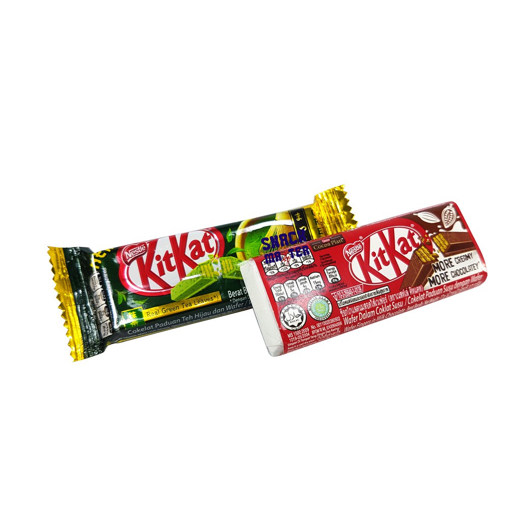 Untuk varian kemasan Kitkat 2F (2 pcs finger wafer) dgn netto 17gr per kemasan ini, kami menyediakan utk anda varian klasik Milk Chocolate wafer dan Green Tea Chocolate wafer. Produksi Nestle Asean (Malaysia) Sdn. Bhd dgn importir resmi PT Nestle Indonesia. Ber-BPOM dan halal MUI. Silahkan di order untuk cemilan ataupun pengganjal lapar anda disela senggang :)