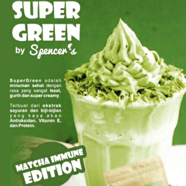 Spencer's Super Green adalah minuman sehat tinggi protein, tinggi antioksidan, tinggi fiber, rendah GI (Glicemix Index), gluten free, sugar free, rendah kalori dan bisa untuk pengganti makan sehingga cocok untuk diet DD Store adalah DISTRIBUTOR resmi produk Spencer's, jaminan 100% PRODUK ASLI PROMO! Dapatkan 1 BONUS GRATIS dengan belanja produk apa minimal 100 ribu, dapatkan 2 BONUS GRATIS dengan belanja produk apa pun minimal 200 ribu. Dapatkan juga bonus-bonus kejutan lain dari kami. Bonus bisa berupa tas, pouch, dompet, dan masih banyak lagi. Dijamin puas belanja di DD Store. Spencer's Indonesia, produsen minuman sehat terbesar di Indonesia kini menghadirkan SuperGreen, minuman sehat dengan rasa smoothies yang sangat lezat, gurih dan super creamy. Terbuat dari ekstrak sayuran dan biji-bijian seperti Biji Sunflower, Almond yg kaya akan Antioksidan, Vitamin E, dan Protein. Kelebihan Super Green Spencer's: - Tinggi Protein: -Tinggi Antioksidan -Tinggi Fiber -Rendah GI (Glicemix Index) -Gluten Free -Sugar Free -Rendah Kalori Varian Rasa : - Original - Choco Healthy - Matcha Immune - Avocadolicious Super Green hadir untuk membantu anda menaikan Antioksidan dan Immune System serta Reparasi Sel pada Tubuh Anda. Cocok juga digunakan untuk Anda yang sedang diet. Diproduksi langsung oleh salah satu produsen minuman sehat terbesar di Indonesia,Super Green dibuat dari berbagai macam ekstrak sayur-sayuran ditambah berbagai macam biji-bijian yang tinggi antioksidan & protein. Cara Pemakaian untuk 1 gelas: - Tuangkan 1 atau 2 sendok makan Supergreen - Tambahkan air dingin atau hangat (jangan panas) & kocok atau diblender ! Langsung bisa siap minum. - Tambahkan buah atau minuman favorit anda seperti Yoghurt, Susu, madu dll. - Bisa ditambahkan Es cream atau es batu untuk membuat Smoothies lebih nikmat.