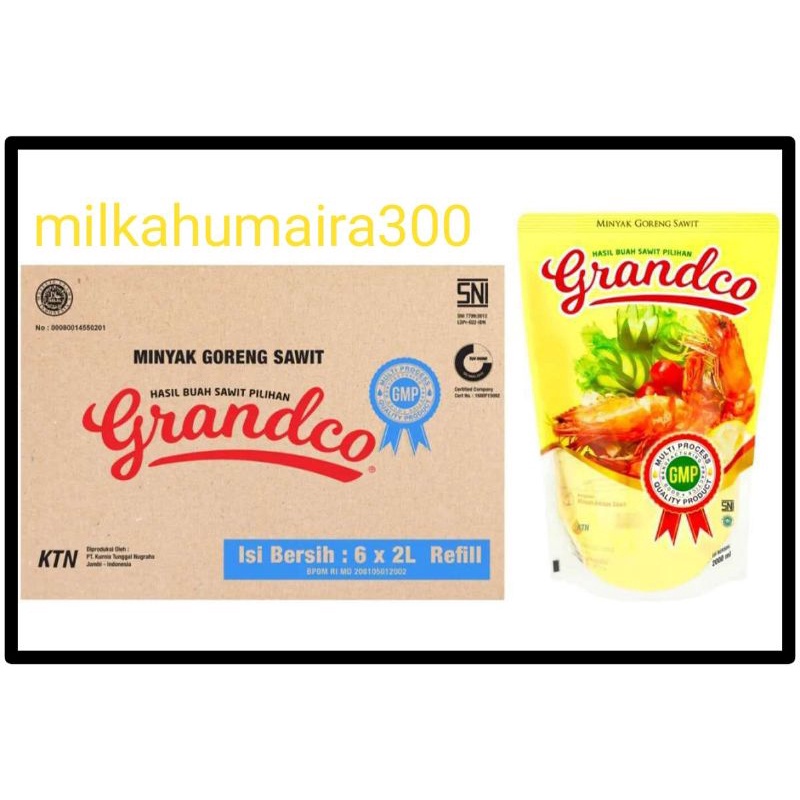 Minyak grandco kemasan pouch 2 liter minyak goreng grandco 2 liter.Minyak goreng bening cocok untuk memasak jenia semua masakan karena minyak bening terbuat dari kelapa sawit.Exp.date aman karena kami menjual secara online maupun offline .Yuk Order sekarang juga.