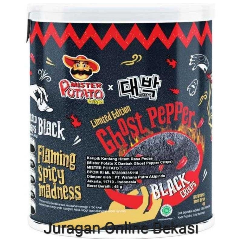 MISTER POTATO X DAEBAK GHOST PEPPER CRIPS ADALAH PRODUK TERBARU MISTER POTATO, BERKOLABORASI DENGAN DAEBAK, BRAND PENGHASIL PRODUK VIRAL MAMME X DAEBAK NOODLE GHOST PEPPER. DENGAN BUMBU YANG SAMA, DITABURKAN DI CRIPS MISTER POTATO, MENGHASILKAN KERIPIK HITAM PEDAS GHOST PEPPER DENGAN LEVEL KEPEDASAN TERTINGGI DARI SEMUA JENIS CABAI.