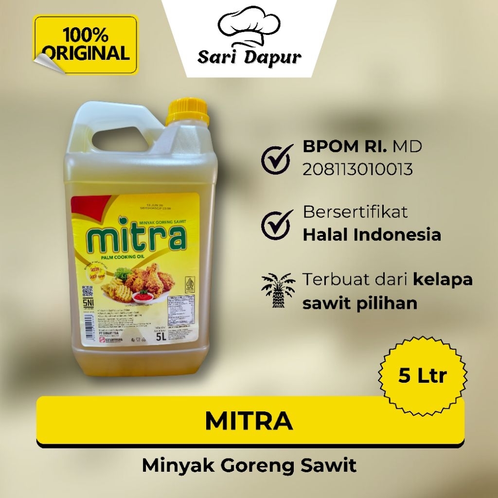 MITRA Minyak Goreng Sawit membuat masakan menjadi garing, gurih, dan renyah. Terbuat dari kelapa sawit pilihan, warna kuning keemasan dari beta karoten alami, serta dapat digunakan untuk menumis dan menggoreng.