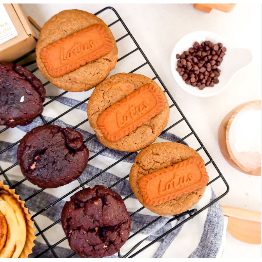 - Lotus Pocus (cookie with lotus biscoff spread filling and lotus biscoff biscuit)