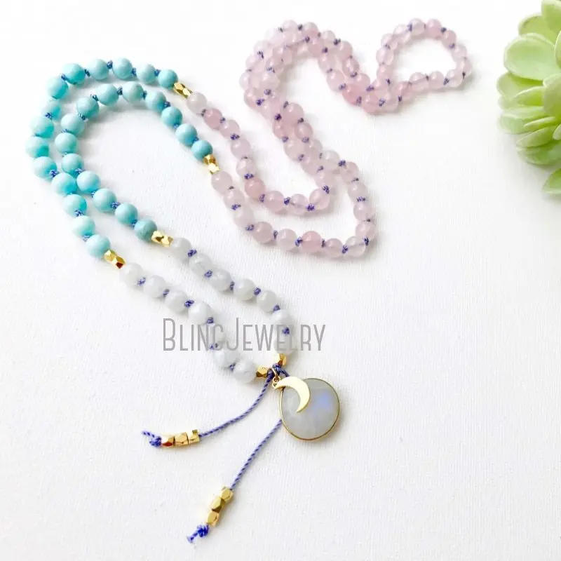 MN19849 розовый кварц Бирюзовый лунный камень Мала ожерелье бусины узлом молитва