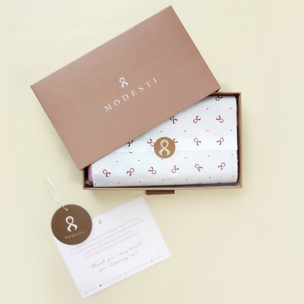 Ingin berikan kado untuk orang tersayang? Tambahkan Paperbag atau Extra Box pada pembelian produk MODESTI. Jadi kamu tidak perlu ribet lagi cari kertas kado, Queen!