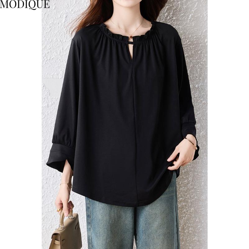 MODIQUE Весна Лето Большой Размер Новая Женская Свободная Винтажная Однотонная Блузка Рубашки Женская Более Стройнящая Повседневная Оверсайз Длинный Рукав V-образный Вырез Топ Элегантная Леди Черный 5XL чёрный