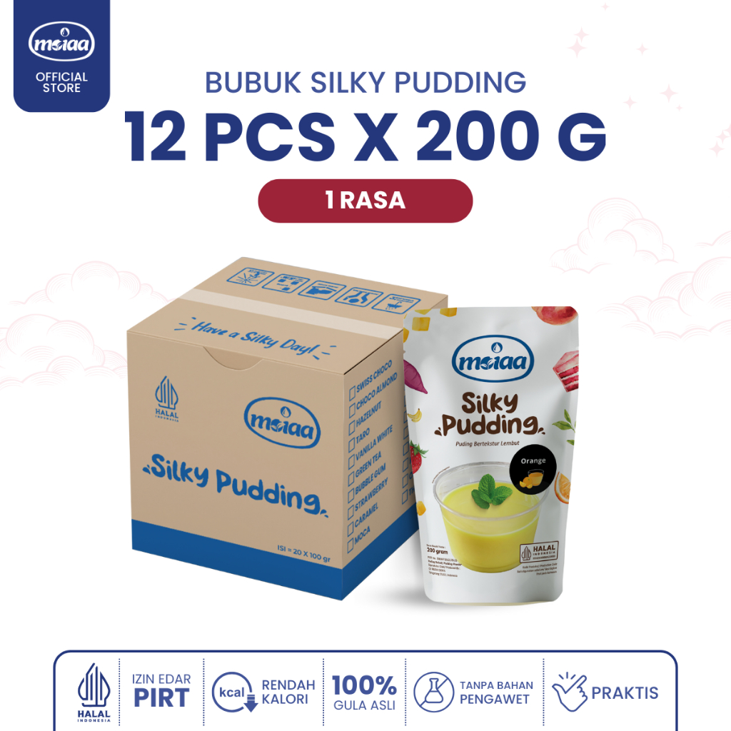 Silky Pudding MOIAA merupakan bubuk bahan puding yang menghasilkan puding bertesktur lembut.