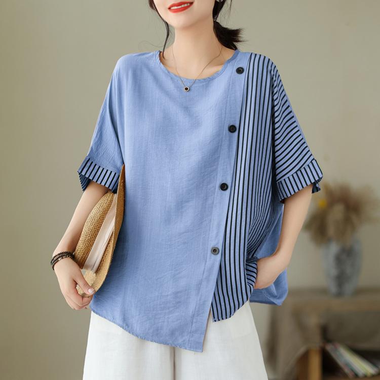 MOJTA женский топ, летняя рубашка с круглым вырезом, свободная полосатая рубашка на пуговицах и короткими рукавами, футболка one size небесно-голубой