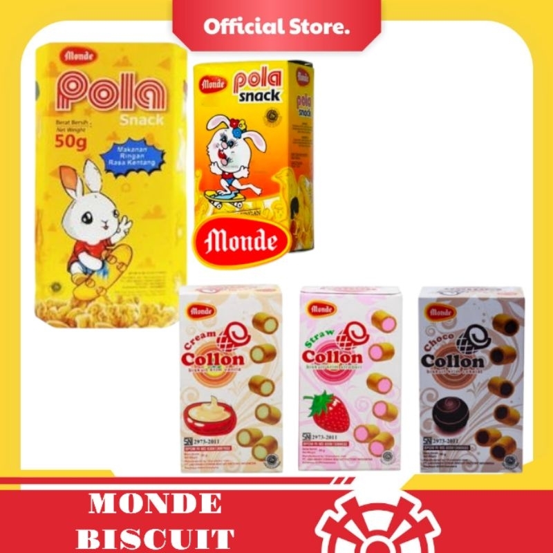 Monde Collon Biskuit merupakan wafer unik berbentuk potongan kecil dengan isian krim yang menggoyang lidah. Tersedia isian krim Vanila, Chocolate dan Strawberry. Rasanya yang manis dan lezat menjadikannya sangat digemari oleh berbagai usia, dari anak muda hingga orang dewasa. Cocok dinikmati sendiri, bersama teman, maupun keluarga. Dikemas secara sederhana dalam kemasan kotak mudah dibawa sehingga dapat dinikmati kapan saja dan dimana saja. Anda juga bisa menyajikannya bersama teh, kopi ataupun susu agar lebih nikmat.
