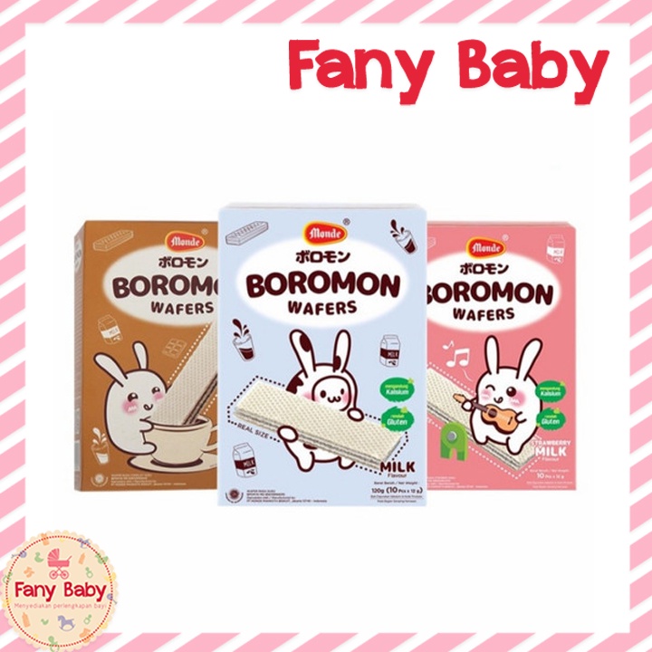 cream. Our wafer is low in gluten and the softness of this wafer makes it melt in mouth. Monde Boromon Wafers is made from locally sourcedpotato starch, strawberrypowders and contains calcium. They are individually wrapped and easy to grab onto. Each of our wafer shape is made perfectly to be held and chewed by your loved ones