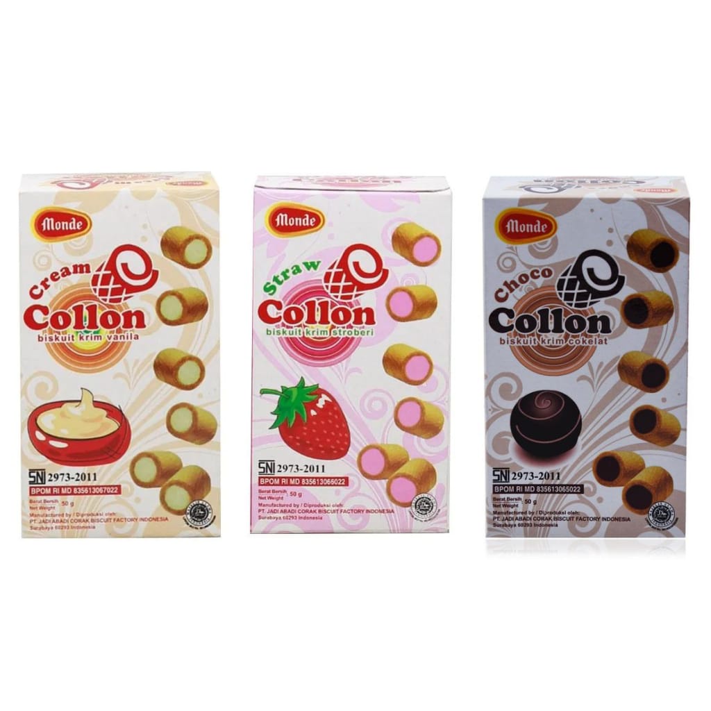 MONDE COLLON adalah Salah satu cemilan dari Monde. Monde Collon ini merupakan biskuit roll isi krim. Biskuit ini terdiri dari lapisan-lapisan pastry agak padat yang membentuk lingkaran tabung yang dipotong -potong dengan ukuran yang pas untuk dijadikan cemilan. Lalu diisi krim padat yang lezat berbagai varian didalamnya. Biskuit yang renyah dengan krim yang enak, sangat pas mengisi snacking time anda dengan cemilan renyah dan manis dengan sensasi yang menyenangkan. Sudah mendapat sertifikasi dari BPOM RI dan Halal MUI, dikemas dalam kotak mini, sangat pas untuk menemani anda diberbagai suasana.