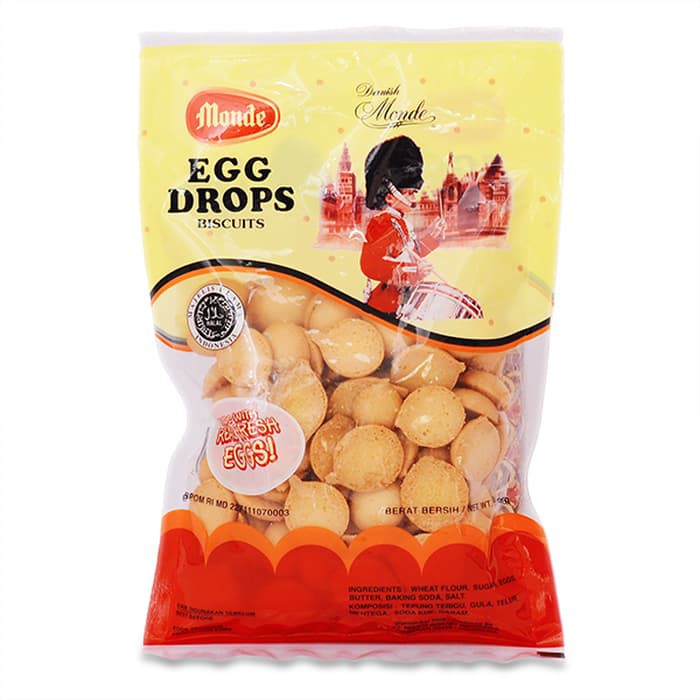 1Nikmati kelezatan Monde Egg Drops Biscuit yang telah disukai dari generasi ke generasi. Biskuit Egg Drops ini memiliki rasa dan dimensi yang klasik, tak lekang oleh waktu. Rasa gurih yang dihasilkan dari telur asli membuat biskuit ini memiliki nilai gizi yang tinggi. Bentuk setengah bulat yang unik membuat siapa saja mengenal produk ini sebagai teman setia menikmati teh dan kopi. Biskuit ini juga nikmat dibawa kemana saja sebagai bekal perjalanan Anda.