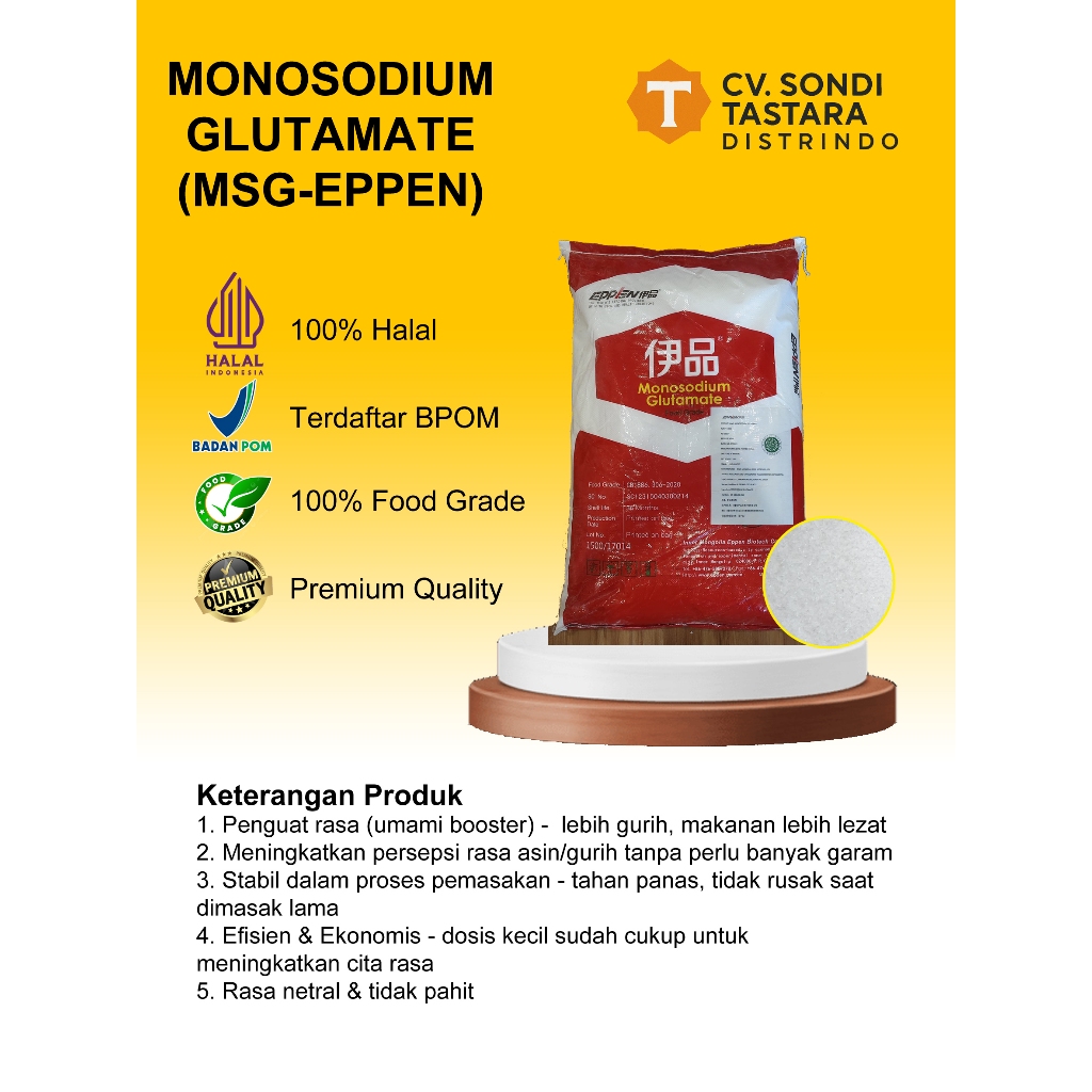 Monosodium Glutamate (MSG) food grade dari merek terpercaya EPPEN, bikin masakan makin gurih, sedap, dan kaya rasa!