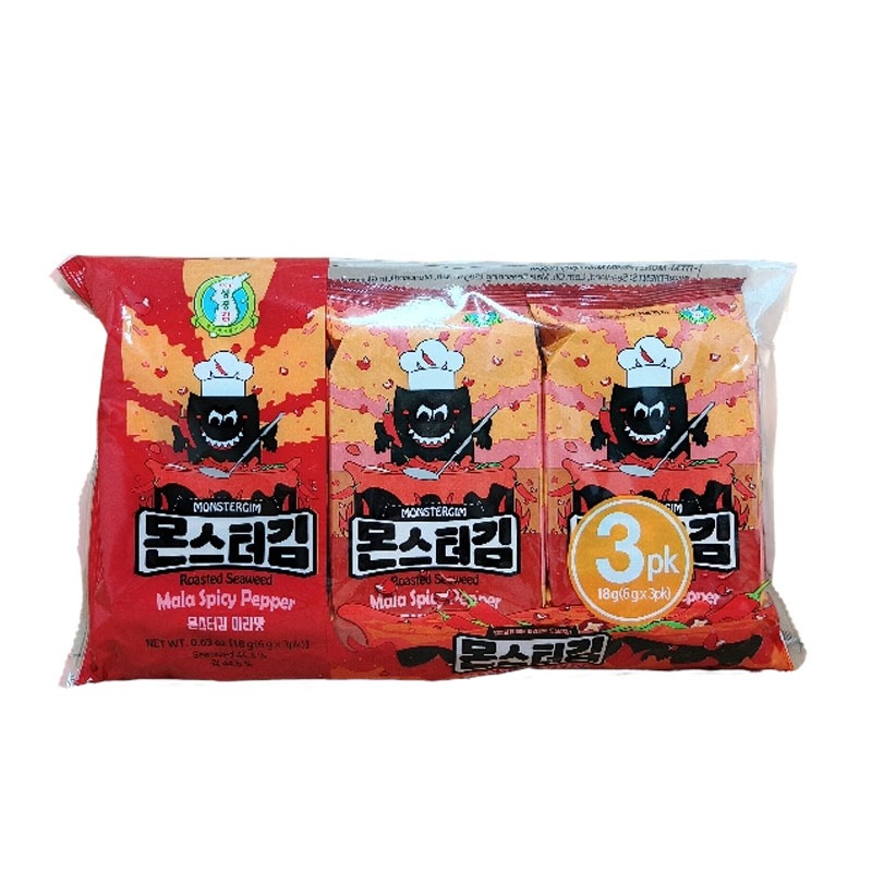 Monster Gim Buldak Snack rumput laut dengan rasa mala otentik pedasnya . Cocok sebagai cemilan atau topping ramen atau mie kuah.
