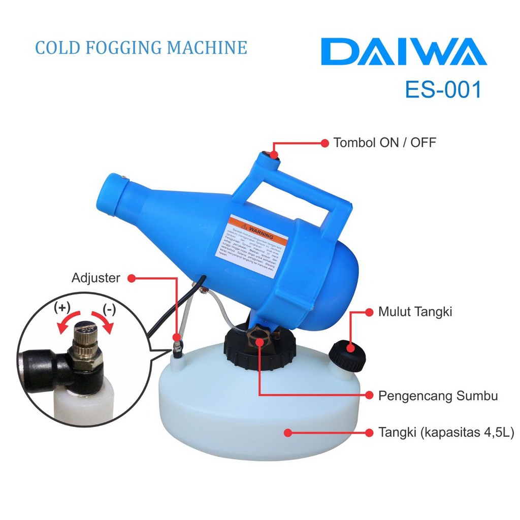 MESIN COLD FOGGING PORTABLE 4.5 LITER (FIRST HAND IMPORT)petunjuk pemakaian bisa dibuka melalui:https://www.youtube.com/watch?v=XOUedXy9fEADeskripsi:- Desain ringkas, lebih praktis untuk penggunaan ruangan kecil-medium- Alat pengendali virus dan hama- Kontainer dapat diisi dengan cairan disinfektan (belum termasuk)Spesifikasi:> Kapasitas tangki : 4.5 liter> Tegangan listrik : 220V/50 Hz> Daya pengasapan : 150-260 ml/menit> Jarak pengasapan : 8-10 meter> Bobot kosong : 3.5 kg- Cocok untuk gedung perkantoran, perumahan, apartemen, atau gudang- Dimensi produk : 43 x 26 x 43 cmTindakan pengasapan atau fogging merupakan tindakan pencegahan yang dapat dilakukan dengan mudah untuk mengendalikan dan menghilangkan virus dan hama penyebab wabah penyakit. Mesin ini menggunakan listrik 220V yang akan mendorong cairan disinfektan ke udara sepanjang 8 hingga 10 meter. Dilengkapi dengan ukuran tangki sebesar 4.5 liter yang dapat menghasilkan uap pengasapan sebanyak 150-260 ml/menit ke udara.Mesin fogging portable sangat efektif digunakan karena selain tidak terlalu bising saat digunakan, mesin ini hanya memiliki bobot kosong seberat 3.5 kg. Cocok digunakan untuk tindakan preventif skala kecil pada gedung perkantoran, perumahan, apartemen, atau gudang.* READY STOCK* BARANG IMPORT FIRSTHAND