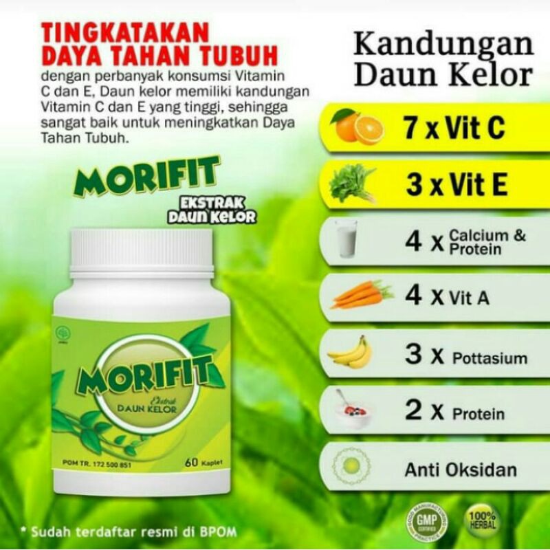 MORIFIT mengandung bahan berkhasiat Ekstrak Daun Kelor yang membantu memelihara kesehatan.