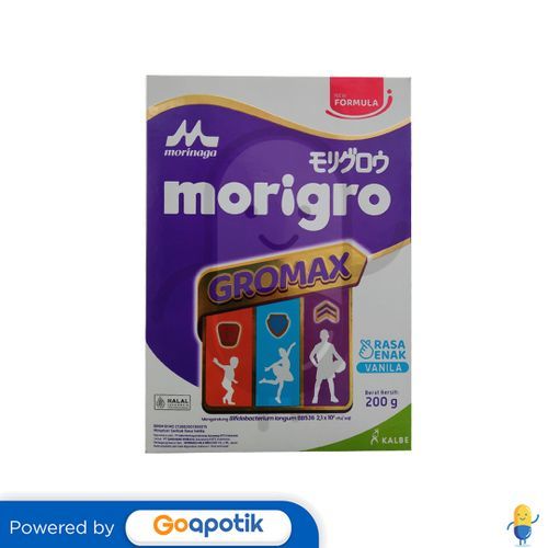 Deskripsi : Morigro adalah susu pertumbuhan untuk anak usia 1 tahun ke atas dengan formula GROMAX untuk mendukung kenaikan BB Ideal dan meningkatkan nafsu makan, menjaga daya tahan tubuh serta tumbuh kembang optimal. | Komposisi : NA | Dosis : NA | Indikasi : Morigro adalah susu pertumbuhan untuk anak usia 1 tahun ke atas dengan formula GROMAX untuk mendukung kenaikan BB Ideal dan meningkatkan nafsu makan, menjaga daya tahan tubuh serta tumbuh kembang optimal. | Perhatian Khusus : NA | Kemasan : Box @200 gram | NIE : MD 272882001300015