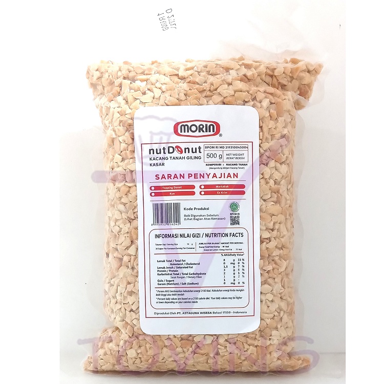 Kacang Cincang yang sudah di sangrai dari Morin yang terbuat dari kacang dengan kualitas no 1, cocok digunakan untuk topping donat, kue (roti) atau berbagai macam snack dan minuman.