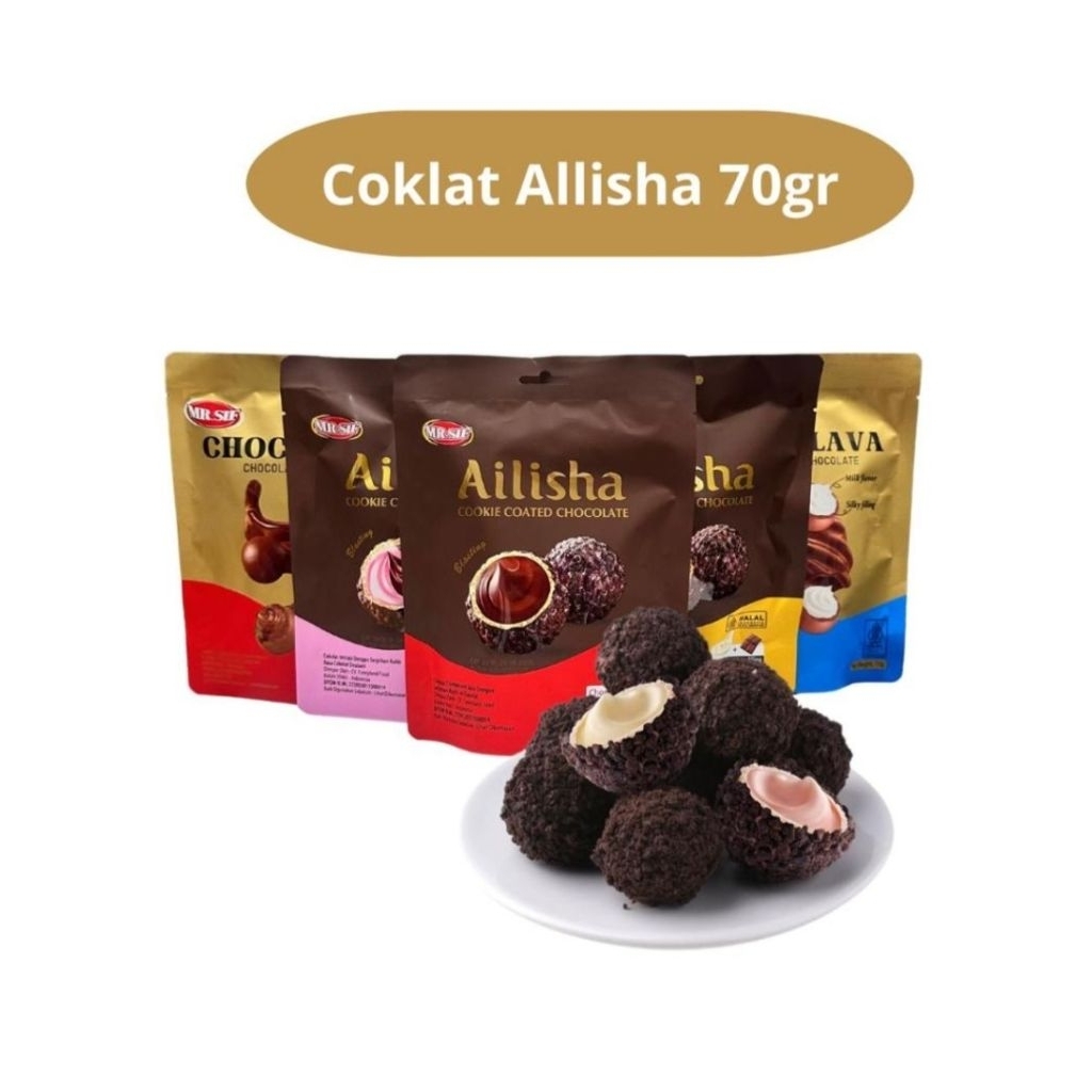 Produk dalam gambar adalah cokelat Ailisha dari Mr. SIF, yang tersedia dalam varian Cookie Coated Chocolate dan Golden Chocolate.