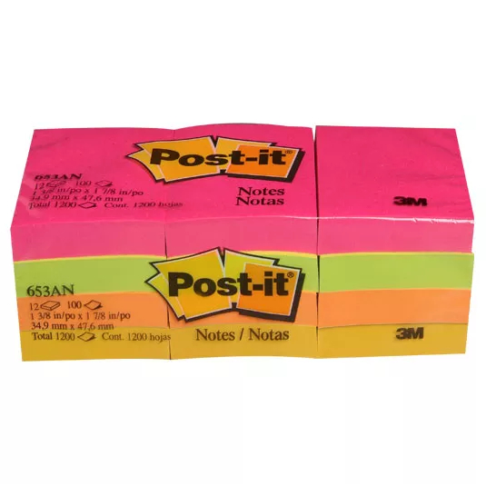Post-it Sticky Notes classic dengan lima warna Neon dalam satu pack: Fireball Fuschia, Neon Orange, 3M Yellow, Neon Green, dan Electric Blue.