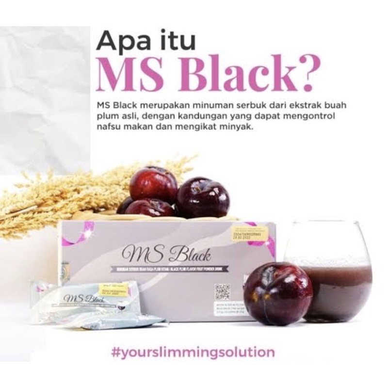 Minuman serbuk buah plum hitam kaya serat pangan, asam amino, pembakar lemak, diperkaya probiotik, antioksidan , vitamin dan mineral Dalam melangsingkan tubuh dalam 15 hari Aturan minum : Diminum jam 18.00 ( sebelum makan malam ) / apabila berat 70 kg Program 15 hari turun 2-4kg Program 30 hari turun 4-10kg Perbanyak minum air putih setelah konsumsi ms slim, serat yg sudah dkonsumsi pd ms slim akan makin mekar sehingga kita akan merasa makin kenyang sehingga makan malam bisa hilang. Diminum malam hari jam 18.00 sehingga pagi hari BAB lancar Efek: kencing lancar ( sering ) dan BAB lancar