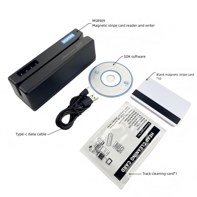 MSR909 — это считыватель-записыватель-кодировщик карт с магнитной полосой с такими функциями, как чтение, запись, стирание, сравнение, сохранение в файл, запись в файл и т. д. чёрный