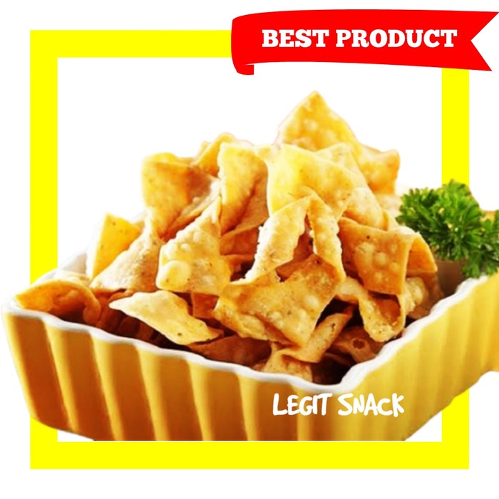 Keripik Berbentuk Pangsit ini mempunyai rasa GURIH, RENYAH, dan AROMA BAWANG. Sekali gigit pasti ingin mencobanya terus menerus. Bisa dicemil Langsung, teman makan Mie atau Nasi, maupun Makanan Kuah lainnya.