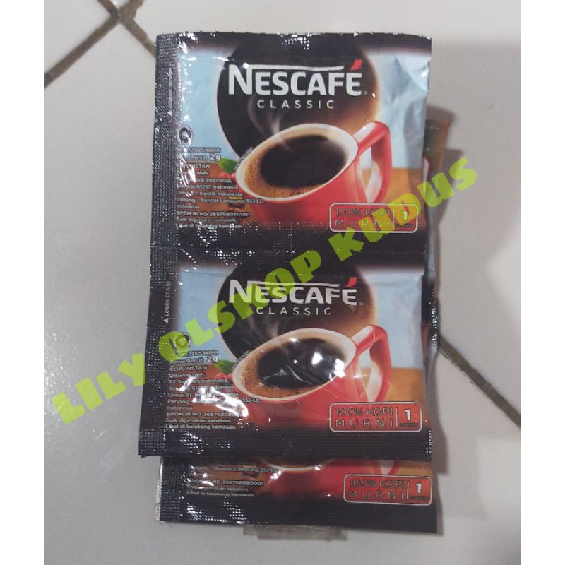 Nescafe Classic Sachet 2gr, adalah kopi hitam instant yang terbuat dari 100% biji robusta Lampung pilihan. Mulailah hari anda dengan aroma kopi hitam NESCAFE Classic yang mantap. Menajamkan semua inderamu, membuka mata dan pikiranmu untuk menjalani hari sepenuhnya.