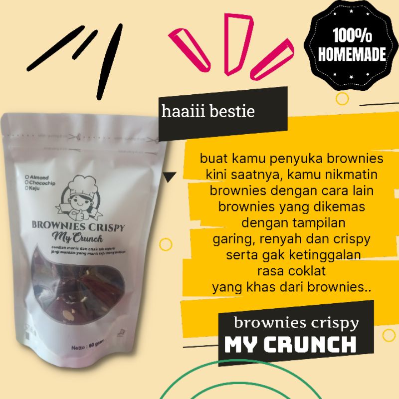 Brownies crispy dengan toping almond yang renyah dan nyoklat abis ini siap nemenin santai mu bestie.. produk dengan citarasa yang tinggi serta dibuat secara homemade aman banget untuk dikonsumsi anak dan dewasa..