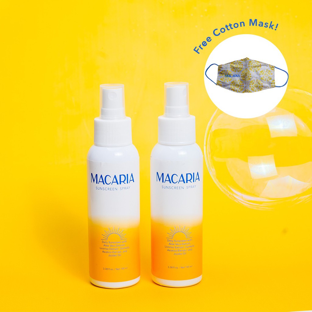 Bundle 2 Macaria Sunscreen Spray Isi : 2 Macaria Sunscreen Spray Free : 1 Cotton Mask (bisa pilih)Sunscreen sangat wajib dan penting digunakan walaupun kita hanya di dalam ruangan saja, karena sinar UV bisa menembus kaca lho. Macaria Susncreen Spray merupakan solusi buat kamu yang males pakai sunscreen, karena praktis banget tinggal disemprot aja . Selain untuk melindungi dari sinar UV yang bisa kamu pakai kapan aja, Macaria Sunscreen Spray juga bisa di pake di semua jenis kulit wajah, bisa kamu pakai sebelum makeup, atau pakai ulang setelah makeup tanpa harus repot touch up. So gak ada alasan buat skip sunscreen kan? Kenapa harus memilih Macaria Sunscreen Spray?1. Macaria Sunscreen Spray sangat mudah di bawa dan mudah digunakan.2. Tidak ada kandungan alkohol.3. Tidak ada parfum sehingga aman digunakan untuk kulit sensitif sekalipun.4. Tidak ada kandungan paraben.5. Tidak menimbulan white cast sehingga cocok digunakan untuk semua jenis warna kulit.6. Membuat kulit lembab serta glowing dari kandungan aloevera, jojoba oil.7.Aman digunakan untuk kulit berjerawat karena mengandung centella asiatica. 8. Kandungan spf 30 .Jadi sunscreen ini bisa dan cocok untuk semua jenis kulit wajah :)Selain itu, highlight ingredients yang digunakan ialah Aloe vera leaf extract bermanfaat untukmembantu melembabkan kult wajah, mencegah penuaan dini.Licorice extract bermanfaat sebagai anti infamasi-antioksidan dan dapat melindungi kulit dari efek sinar uv, mengontrol minyak pada kulit.Centella asiatica extract bermanfaat untuk membantu mengurangi jerawat, anti-infalamasi, mengatasi peradangan.Jojoba oil bermanfaat untuk tabir surya alami, penyeimbang minyak di kulit wajah.Titanium dioxide, zinc oxide bermanfaat sebagai tabir surya alami.Bpom NA : 18201700695Isi : 100 ml