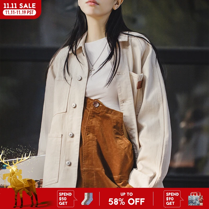 Maden Женская джинсовая куртка из хлопковой скорлупы 13.5OZ с 4 карманами для осени и зимы винтажная рабочая куртка для улицы и на каждый день женская белая джинсовая куртка с длинными рукавами и отложным воротником