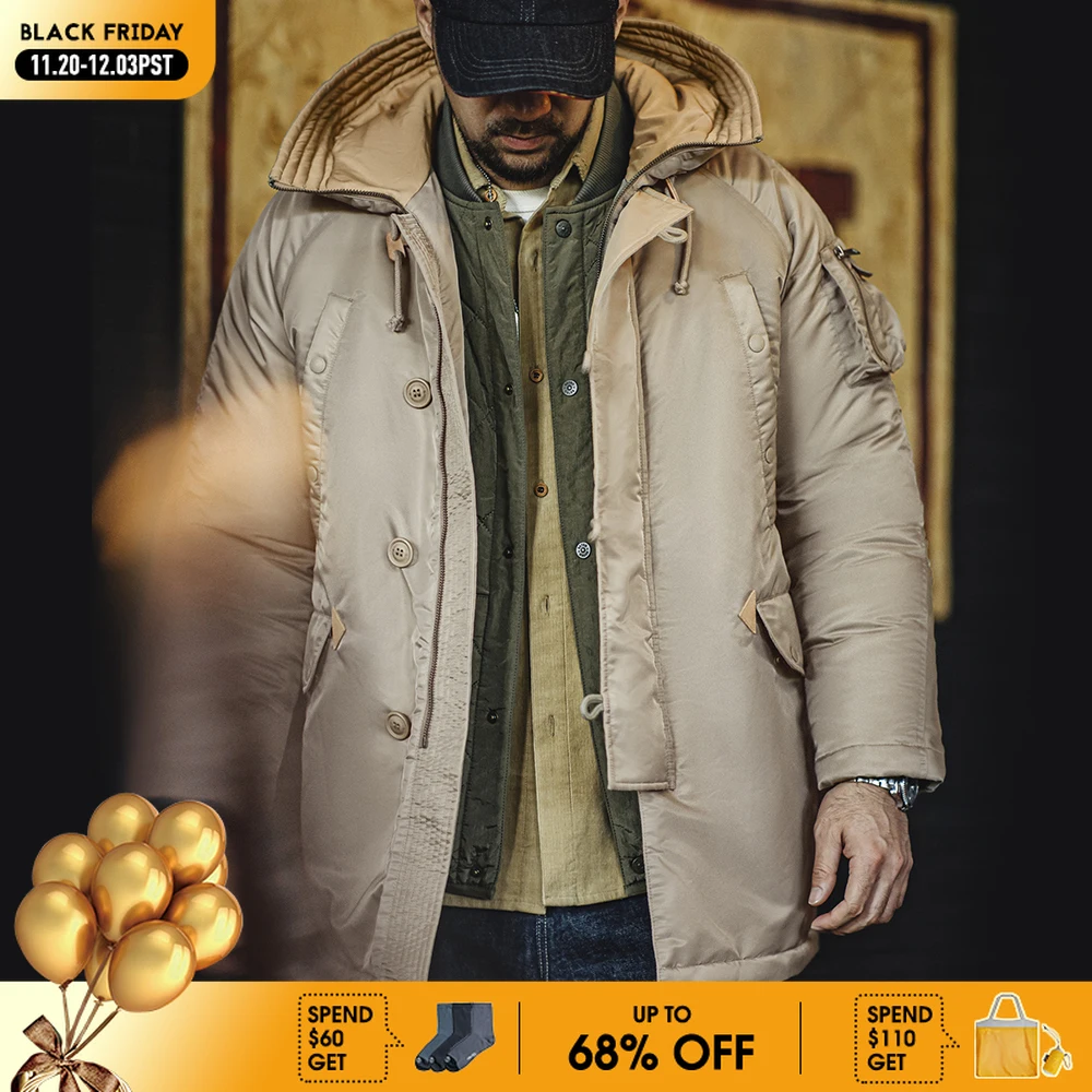 Maden Retro Pilot Cotton-padded Jacket Thickened Mid-length Hooded Warm Coat for Men's Autumn and Winter Khaki Color Outwear