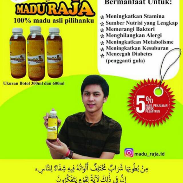 Madu Raja adalah Produk Madu pilihan yang di kemas dalam botol yang elegan dan menarik. Madu Raja dapat dipergunakan sebagai pemanis alami madu juga dapat digunakan sebagai pengganti gula untuk selai roti, pemanis masakan atau minuman seperti teh, lemon dll. so gunakan madu sebagai pemanis terbaik untuk hidup lebih sehat.
