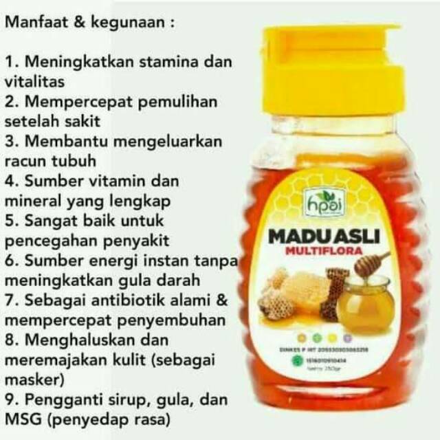 Madu asli HPai Multifilora merupakan madu alami tanpa tambahan bahan lain yang terjamin mutu dan keasliannya serta lebih terjaga keutuhan kandungan gizinya. Dihasilkan dari lebah madu unggul.