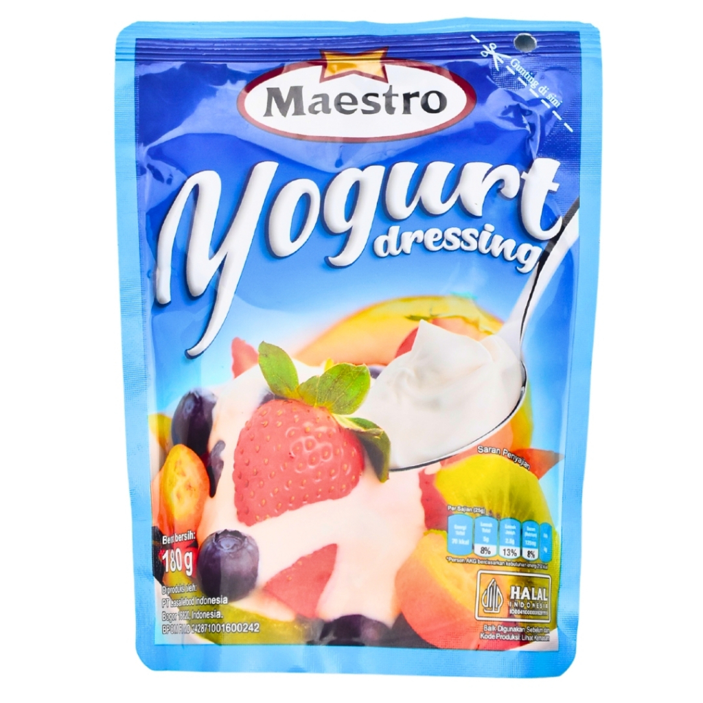 Maestro Yogurt Dressing dibuat dengan bahan berkualitas, untuk menjadi solusi praktis, dan menambah kelezatan berbagai sajian. Dapat langsung dicampur dengan buah atau sajian lainnya tanpa perlu menambahkan yogurt, kental manis, atau mayonnaise.