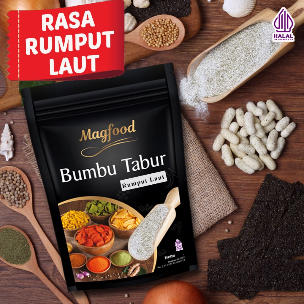 Magfood bumbu tabur rasa rumput laut merupakan bumbu dengan rasa khas rumput laut yang unik. Dipadukan dengan berbagai bumbu dan memiliki rasa yang didominasi oleh rasa manis, asin, dan gurih. Memiliki warna putih dengan bintik hijau dari bubuk rumput laut.