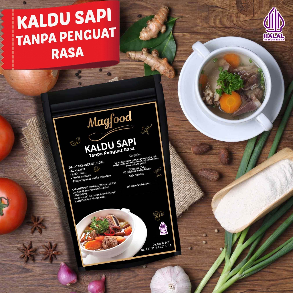 Magfood kaldu sapi Tanpa Penguat Rasa adalah bumbu masak dengan bahan baku pilihan. Menyajikan rasa gurih dengan flavor khas daging sapi. Rasa gurih pada bumbu ini berasal dari perpaduan antara rempah-rempah, ekstrak daging sapi, dan berbagai bumbu lainnya.Setifikat Halal No. ID00210000095190920 Depkes RI PIRT 5113171010132-25