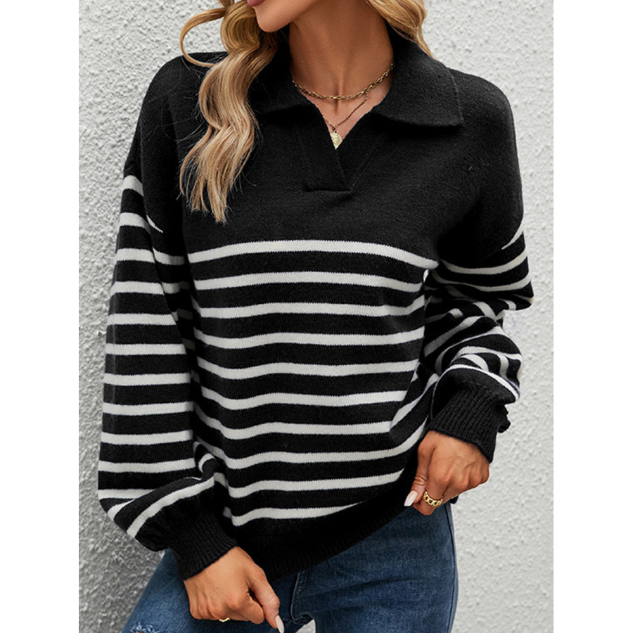 top da donna,maglione a maniche lunghe con risvolto a contrasto a righe casual