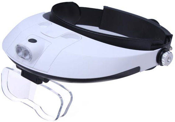 Основные характеристики Magnifier 81001-G Бинокулярная лупа Magnifier 81001-G является упрощенной моделью лупы Magnifier 81001-H. Основное ее отличие - отсутствие верхнего фиксатора на голове, а технические характеристики остаются такими же. В комплекте Magnifier 81001-G есть 5 сменный стекол: 1X, 1.5X, 2X, 2.5X, 3.5X. Стекла устанавливаются в два ряда, поэтому появляется возможность получить дополнительные увеличения: 3X, 4X, 4.5X, 5X, 5.5X, 6X. Бинокулярная лупа Magnifier 81001-G имеет светодиодную (LED) подсветку на 2 светодиода, которая светит ярким белым светом, не мерцает, имеет долгий срок службы. Подсветка регуляруется в вертикальном положении, позволяя направить луч света на увеличиваемый объект. Лупа крепится на голове с помощью специального фиксатора, который охватывает голову пользователя и плотно фиксирует бинокулярную лупу. Специальный механизм позволяет использовать лупу практически на любом размере головы. Материал линз - плексиглас. Линзы сделаны очень качественно, их размер (105 х 38 мм) идеально спроэктирован для глаз пользователя. В данной бинокулярной лупе Magnifier 81001-G в комплекте имеются 5 сменных линз, но при использовании двух линз одновременно (конструкция лупы это позволяет) можно достичь 11!!! различных степеней увеличения! Рекомендации при работе с увеличениями на различных дистанциях от линзы: Увеличение Дистанция до объекта 1.0 X 300-350 мм 1.5 X 240-260 мм 2.0 X 215-235 мм 2.5 X 205-225 мм 3.0 X 160-180 мм 3.5 X 135-145 мм 4.0 X 125-135 мм 4.5 X 110-130 мм 5.0 X 100-120 мм 5.5 X 80-95 мм 6.0 X 60-85 мм Данные указаны приблизительные! Человеческий глаз способен по-разному воспринимать увеличительные приборы!