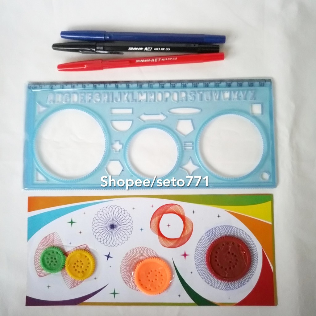 Mainan Spiral Drawing Ruler Pattern + Ballpoint 3 pcs Biru Merah Hitam