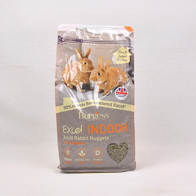 Burgess Excel Indoor Adult Rabbit Nuggets Rabbit Pellet Food is a dry rabbit food that is infused with dandelion to make each pellet tastier!Enriched with vitamin D, Burgess Excel Indoor Adult Rabbit Nuggets Rabbit Pellet Food supports healthy skin, teeth and bones.Supplemented with prebiotics, Burgess Excel Indoor Adult Rabbit Nuggets Rabbit Pellet Food strengthens your rabbit’s immune system and promote healthy gut bacteria.Burgess Excel Indoor Adult Rabbit Nuggets Rabbit Pellet Food has beneficial fibre content in balanced amount that is essential to your rabbit’s diet.Made in the UK, Burgess Excel Indoor Adult Rabbit Nuggets Rabbit Pellet Food is suitable for adult rabbits from 4 months to 5 years of age.IngredientsGrass, Wheat, Oat Feed, Soya Bean Hulls*, Sunflower Seed Meal, Yeast, Soya Oil, Minerals, Short-chain fructo-oligosaccharides 0.25%, Dandelion 0.2%, Nettle 0.2%.*May contain GM materials.Nutritional AnalysisBeneficial Fibre 40%, Crude Protein 14%, Crude Fat 4%, Crude Fibre 20%, Crude Ash 6%.Suitable ForAdult rabbits from 4 months to 5 years of age.Country of OriginMade in the UK.