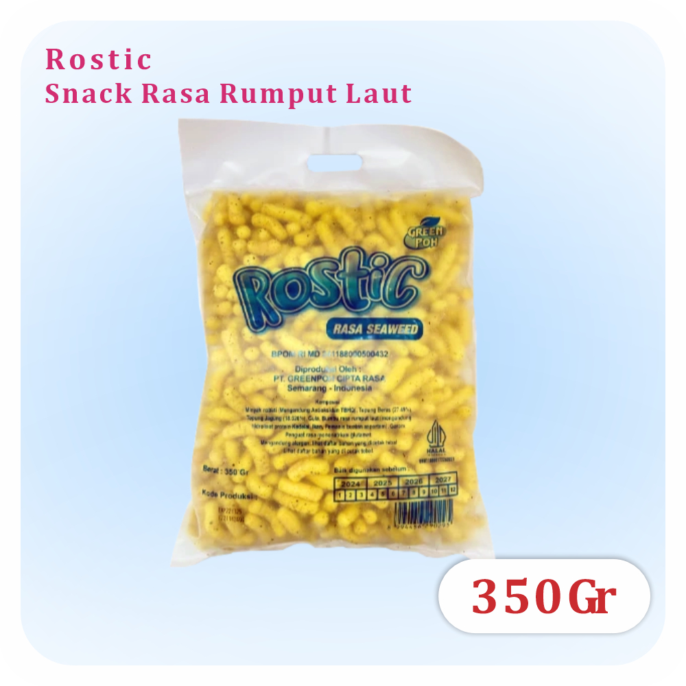 Rostic Rumput Laut merupakan salah satu varian snack super renyah berbentuk stick. Hadir dengan rasa rumput laut gurih, crunchy & nikmat, membuat Rostic Rumput Laut ini dapat menjadi teman yang pas untuk menemani camilan waktu santai & teman makan.