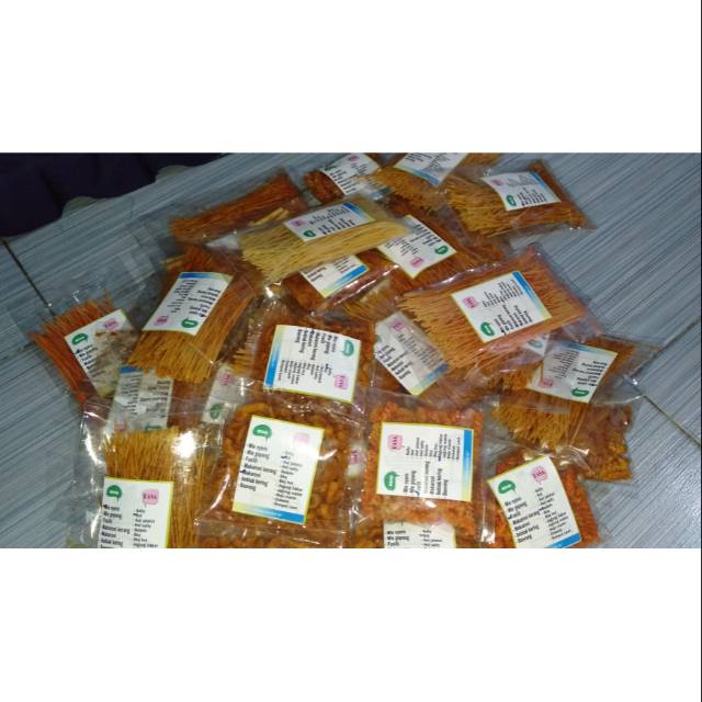 Mie nyere, mie gepeng, fusili, makaroni kerang, makaroni, seblak, dan basreng dengan varian rasa dan ukuran yg berbeda