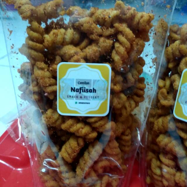 Makaroni Spiral krispy,renyah dan di taburi bumbu Rasa Pedas Bbq.. Kemasan Standing Pouch ukuran 12 x 17,5